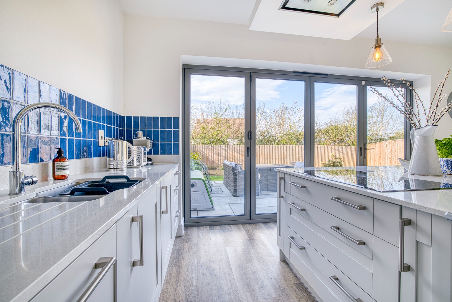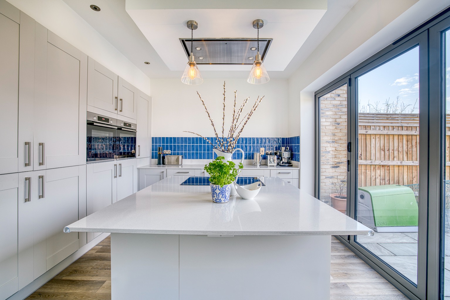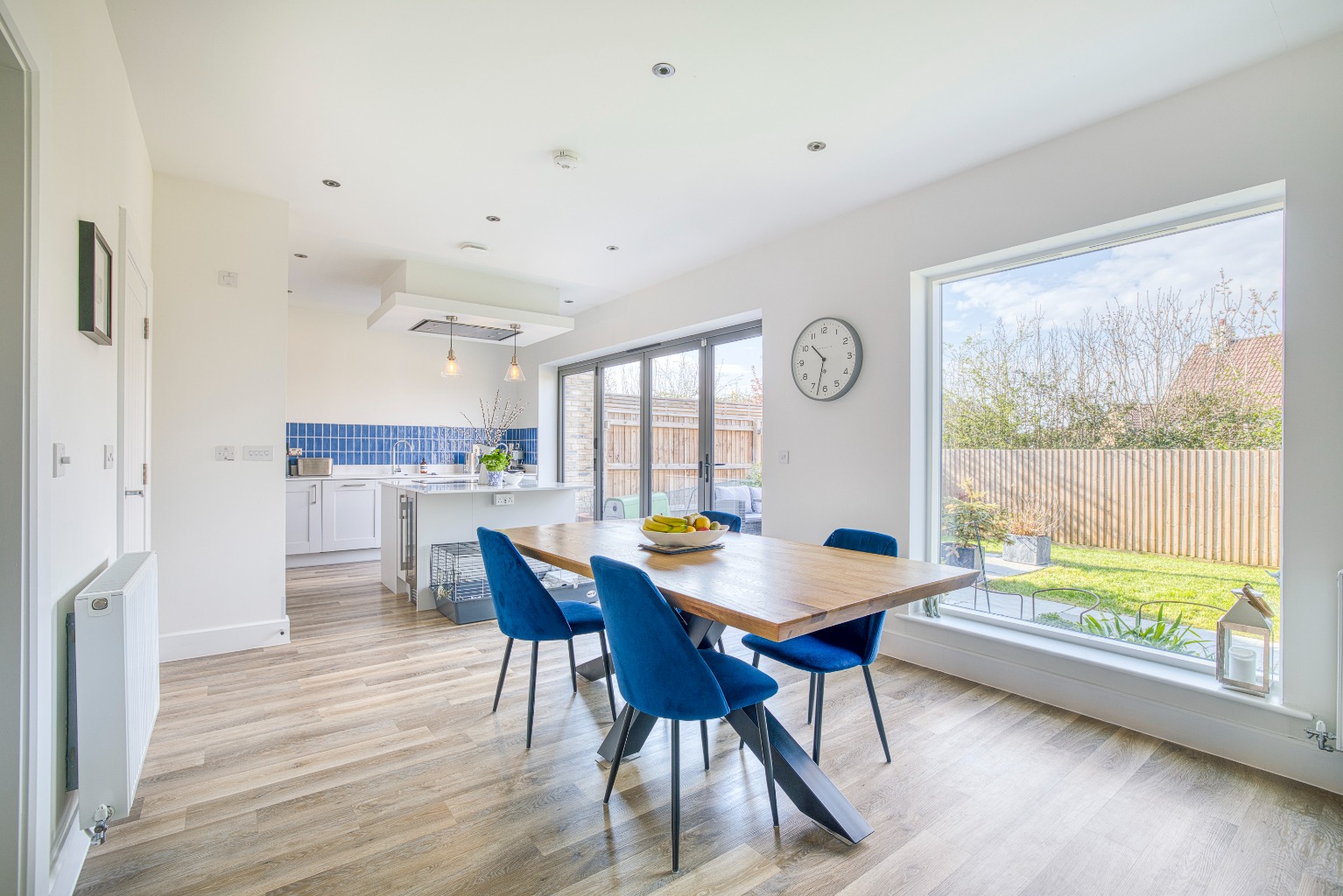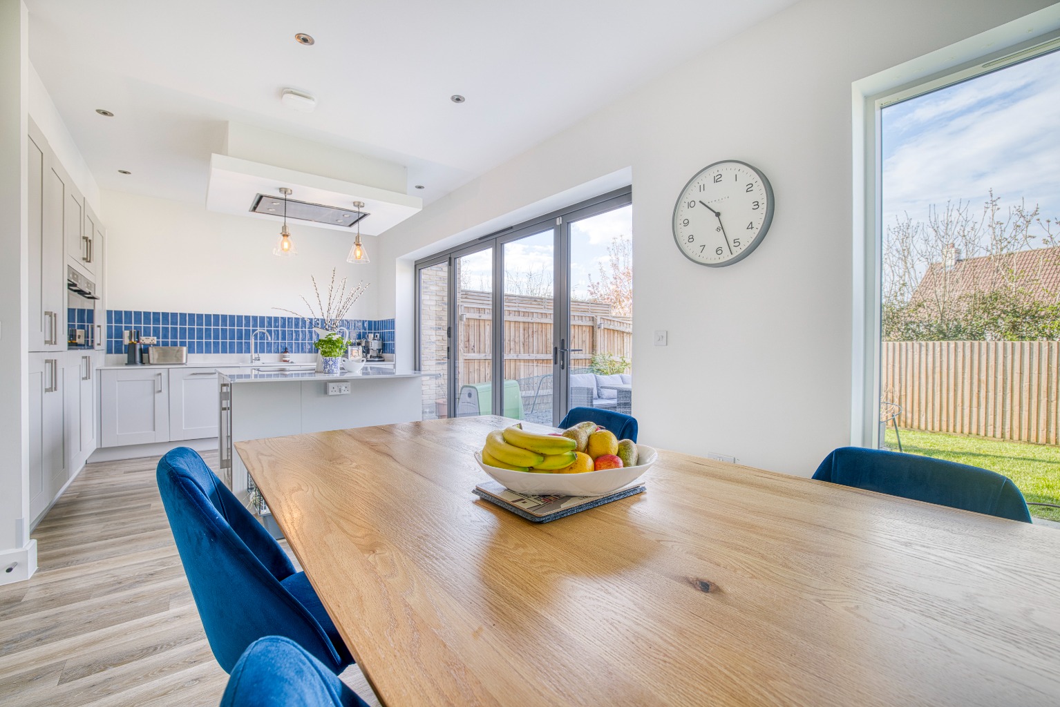 The kitchen/diner, is a spacious and contemporary area fitted with an array of modern units, a central island with an induction hob, and high-end integrated appliances including a double fridge-freezer, a wine cooler, two eye-level ovens, and a dishwasher. Bi-folding doors open onto the rear garden, flooding the space with natural light and providing seamless indoor-outdoor living.