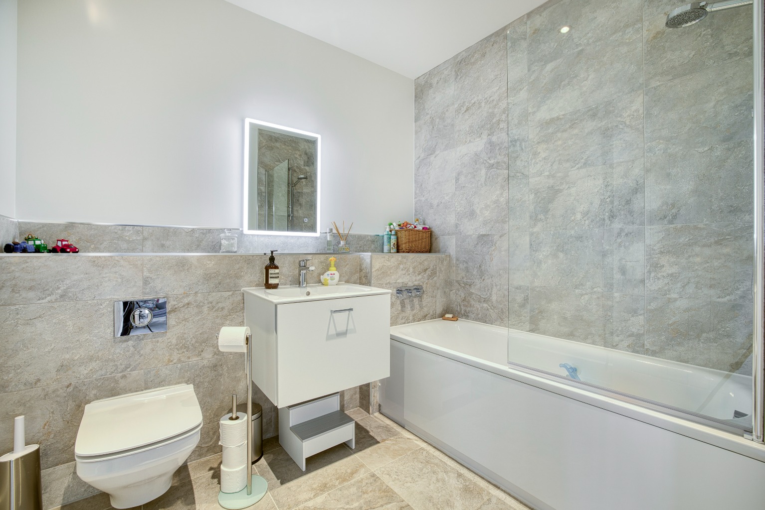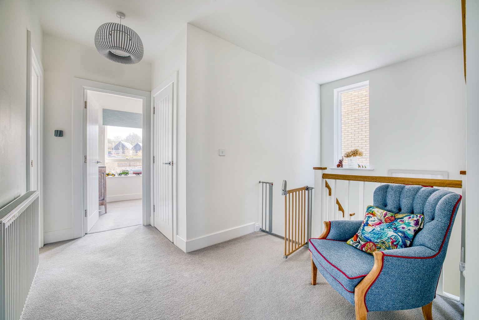 Upstairs, the generous landing leads to four double bedrooms, two of which feature bespoke fitted wardrobes. The principal bedroom enjoys a stylish en-suite, while the remaining bedrooms are served by a beautifully appointed family bathroom comprising a panelled bath, vanity unit with wash basin, and low-level WC. Two sizeable storage cupboards further enhance the practicality of this floor.